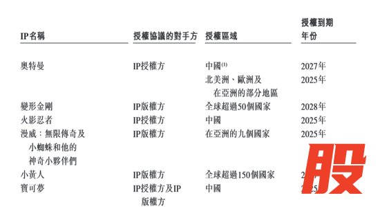 招股书显示,奥特曼IP中国授权到期年份为2027年,北美洲、欧洲及在亚洲的部分地区授权到期年份为2025年。变形金刚IP在全球超过50个国家的授权到期年份为2028年。